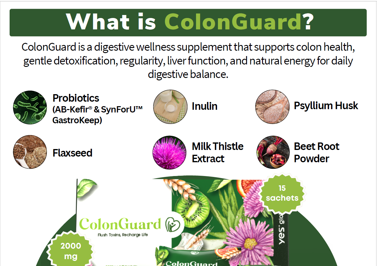 ColonGuard is a digestive wellness supplement designed to support colon health, promote gentle detoxification, enhance regular digestion, and boost gut balance and energy. It combines probiotics, fiber, and natural plant extracts to maintain overall digestive health and daily digestive balance.